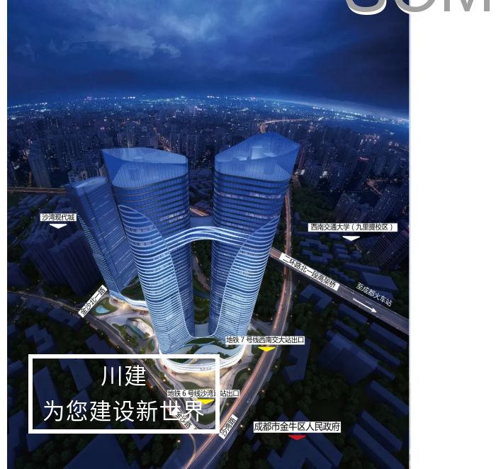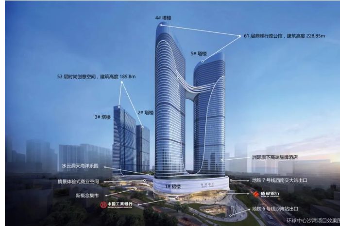 项目由3层商业裙楼(局部4层)及4栋超高层塔楼组成,最高塔楼高达243米,被誉为“摩天双子塔,标定时代天际线”、“新世纪·成都高端峰寓范本,当代高阶天幕艺术品,全球一线臻装选材”,是成都市西北新地标建筑。